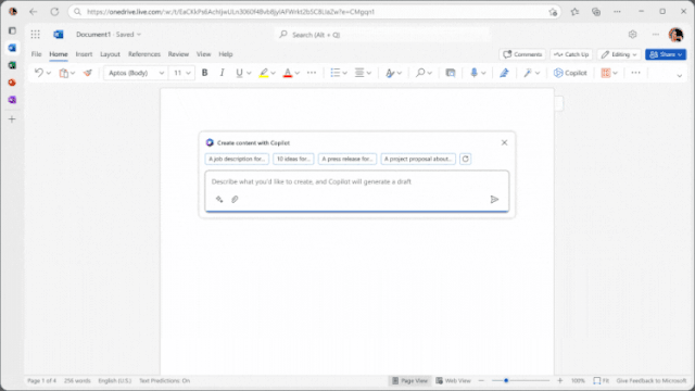 Copilot也可以在整个Office App中调用。Word中的Copilot功能将提供用户可以自由编辑和修改的AI生成文本初稿,节省写作、采购和编辑的时间。