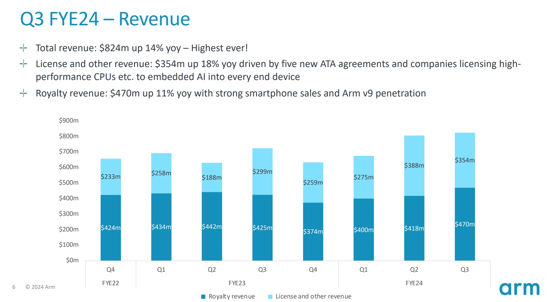 Arm的授权销售额增长18%,达到3.54亿美元;特许权使用费收入增长11%,达到4.7亿美元。