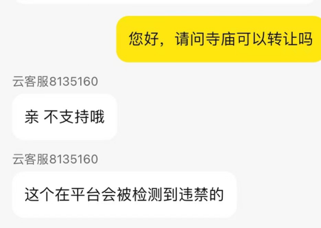 该平台客服回应称,目前官方并不支持寺庙转让,如果平台监测到会违禁处理。