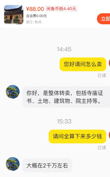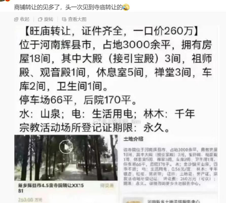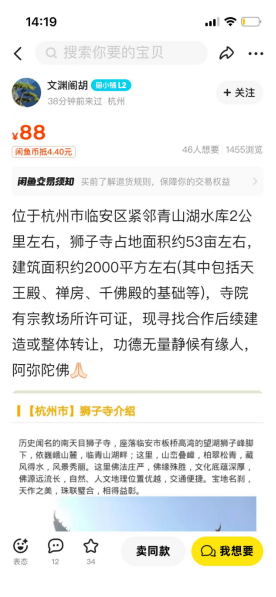 寺庙开始在二手交易平台上转让了?近日发现,二手交易平台上出现了部分转让寺庙的帖子。例如杭州市临安区狮子寺、河南辉县市某寺庙等,均被挂出转让信息。发帖人表示,寺院有宗教场所许可证,挂出是为寻找合作后续建造或整体转让。