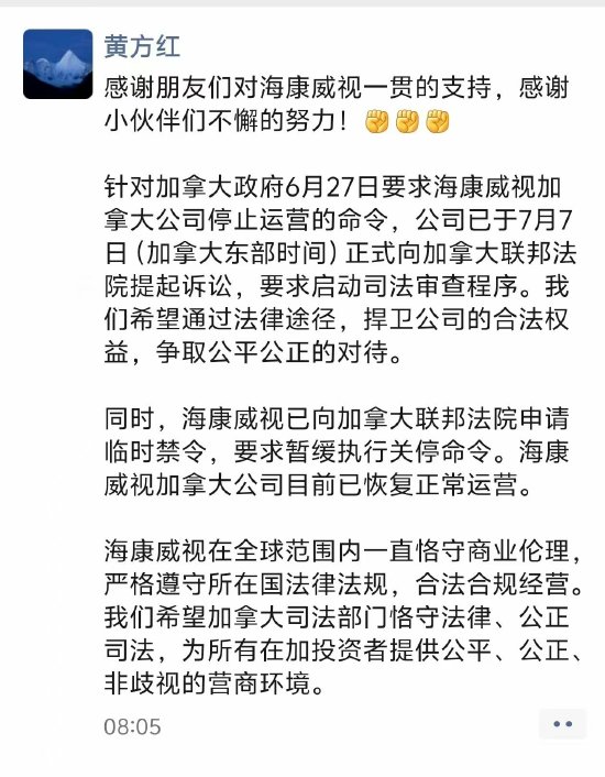 海康威视首席合规官黄方红发文表示,“针对加拿大政府6月27日要求海康威视加拿大公司停止运营的命令,公司已于7月7日(加拿大东部时间)正式向加拿大联邦法院提起诉讼,要求启动司法审查程序。我们希望通过法律途径,捍卫公司的合法权益,争取公平公正的对待。”