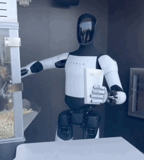 再看机器人擎天柱这边,目前在工厂里打工、在特斯拉餐厅里铲爆米花的机器人,是第二代擎天柱