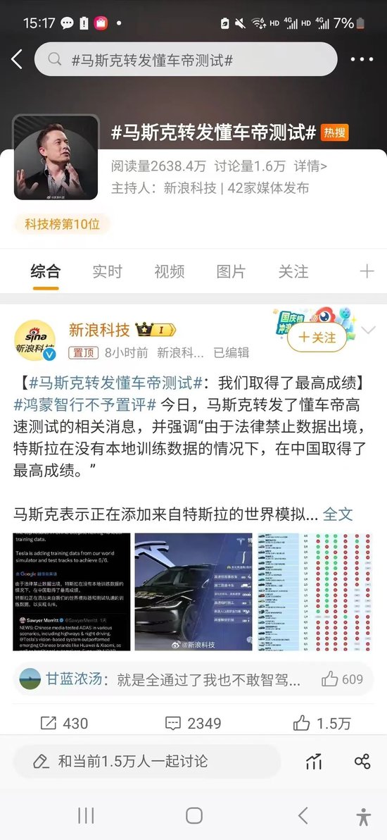 最近有关懂车帝智能辅助驾驶测试的热度持续攀升,多家车企相继回应。725日,特斯拉CEO马斯克转发了懂车帝《懂车智炼场》辅助驾驶科普节目的高速公路场景的测试视频,并配文称:“由于法律禁止数据出境,特斯拉在没有本地训练数据的情况下,在中国取得了最高成绩。”随后,“马斯克转发懂车帝测试”冲上微博热搜。