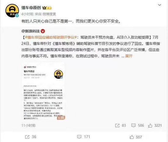 724日,懂车帝发文回应了《懂车智炼场》辅助驾驶科普节目上线后引发的争议,称大量账号通过截取某车型视频内容批量制作图片,以统一口径在各平台及评论区进行广泛发布,相关内容与事实不符。懂车帝回应称,驾驶员没有人为干预方向盘打断车向左变道,AEB触发后,车辆NCA因为AEB持续介入导致功能抑制,NCA抑制后车辆无法执行绕行动作。