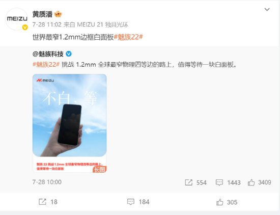 近日,新任星纪魅族CEO黄质潘终于为魅族22预热,称要挑战世界最窄1.2mm边框白面板。预热中的一句话让不少魅族老粉丝看到了希望:“其实我们什么都不怕,唯怕魅族不再魅族。”