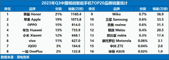 在沈子瑜任期内,虽然魅族手机不断折腾,但市场份额并没有明显的起色。根据此前潮电智库发布的2023年第三季度国内Top20手机品牌销量排名,魅族排名第十二位,第三季度销量为20.5万台,市场份额为0.4%,依然在1%以下徘徊。除此榜单外,其他榜单均只公布前五名的市占率,当然魅族并不在其中。