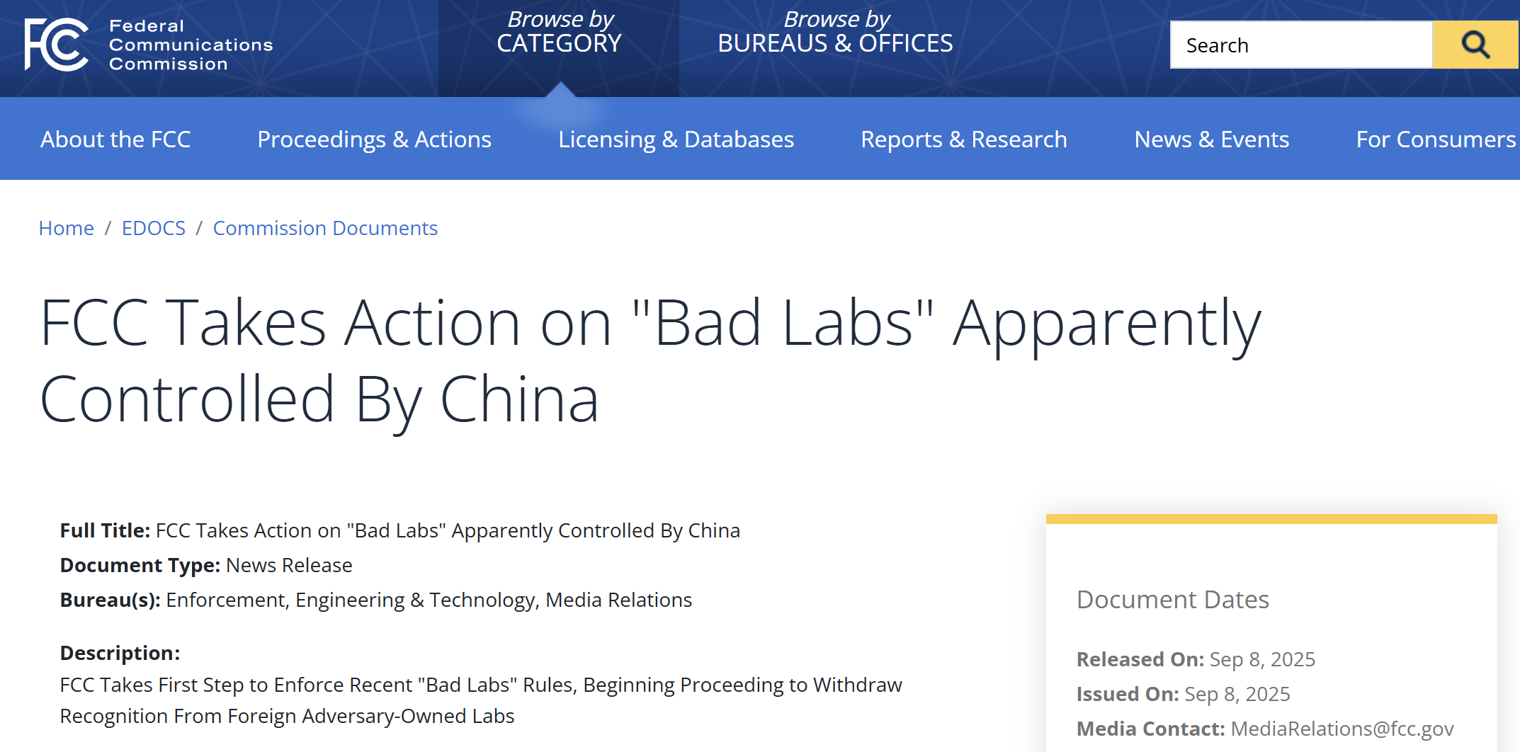 在美国使用的所有电子产品在进口之前都必须通过FCC的设备授权程序。FCC称,约75%的电子产品在位于中国的实验室中进行检测。