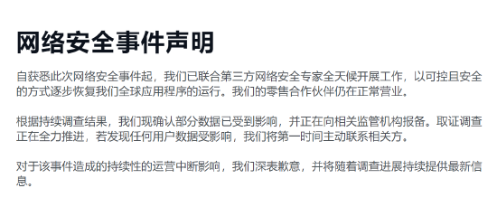 针对此事,捷豹路虎中国官网发布声明称,自获悉此次网络安全事件起,我们已联合第三方网络安全专家全天候开展工作,以可控且安全的方式逐步恢复我们全球应用程序的运行。我们的零售合作伙伴仍在正常营业。 根据持续调查结果,我们现确认部分数据已受到影响,并正在向相关监管机构报备。取证调查正在全力推进,若发现任何用户数据受影响,我们将第一时间主动联系相关方。对于该事件造成的持续性的运营中断影响,我们深表歉意,并将随着调查进展持续提供最新信息。