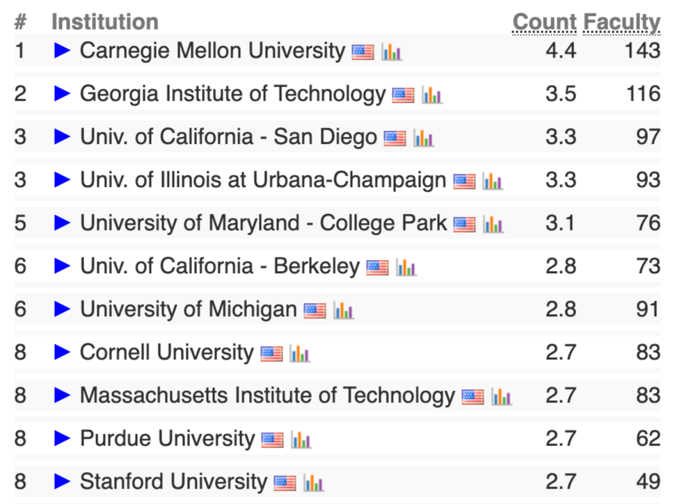但从全球格局来看,美国高校依然众多:除CMU外,伊利诺伊大学香槟分校(UIUC)、佐治亚理工学院(Gatech)、麻省理工学院(MIT)等均位列前20。