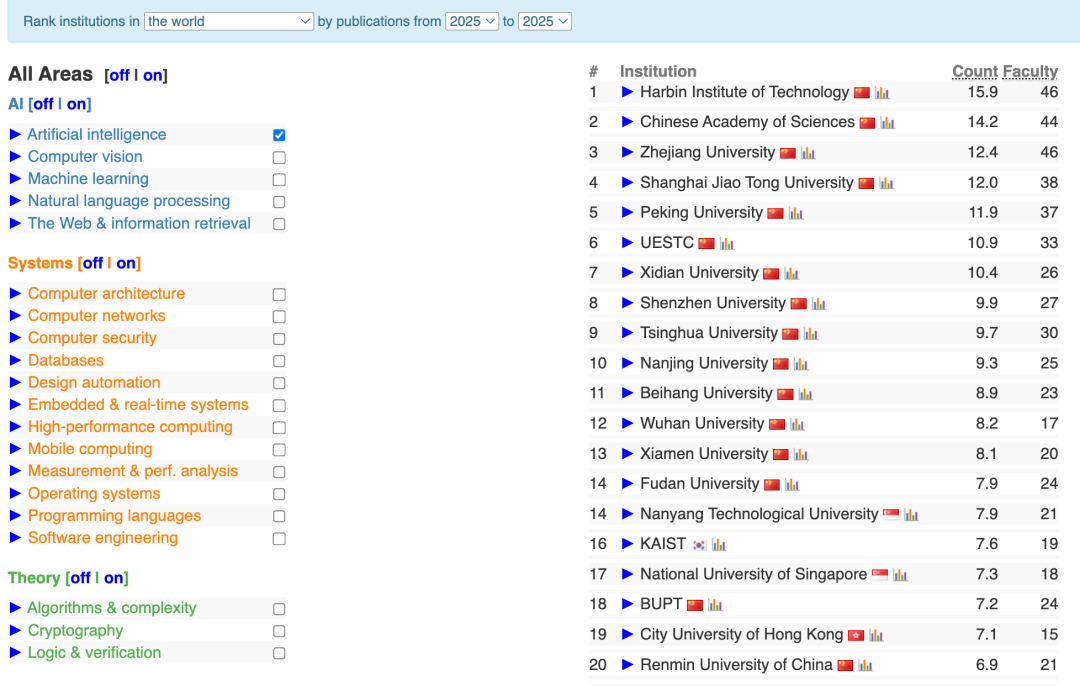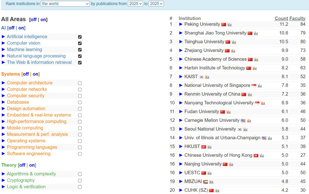 CSRankings仅统计计算机科学四大领域(AI、系统、理论、交叉)中被认可的顶级会议论文。