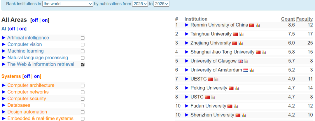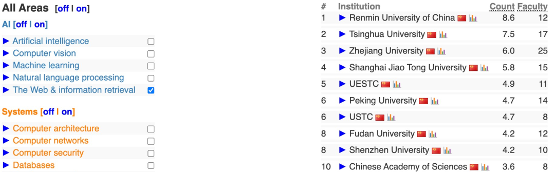在AI大类中选择“网页信息检索”方向,全球前十的高校分别是中国人民大学、清华大学、浙江大学、上海交通大学、格拉斯哥大学、阿姆斯特丹大学、电子科技大学、北京大学、中国科学技术大学、复旦大学、深圳大学。