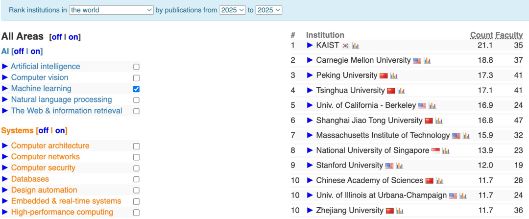 在AI大类中选择“机器学习”方向,全球前十的高校是韩国科学技术院(KAIST)、卡内基梅隆大学、北京大学、清华大学、加州大学伯克利分校、上海交通大学、麻省理工学院、新加坡国立大学、斯坦福大学、中国科学院、伊利诺伊大学厄巴纳-香槟分校、浙江大学。