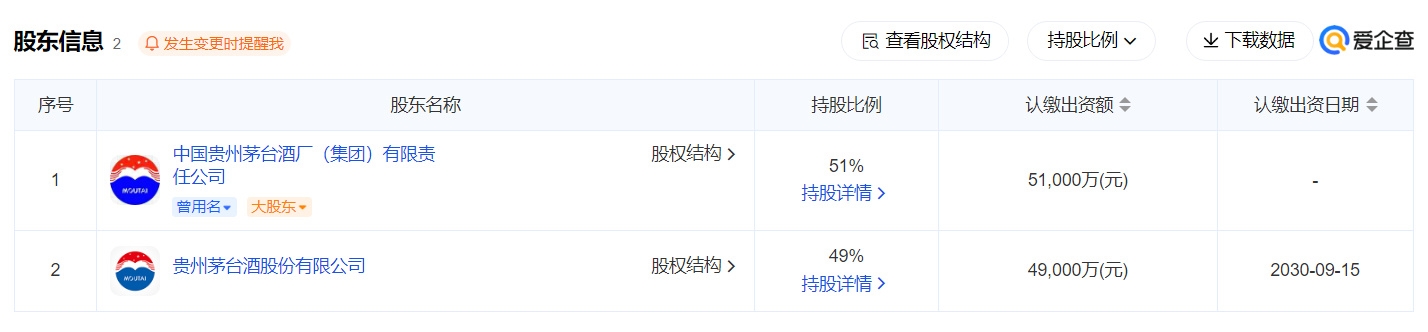 股东信息显示,该公司由中国贵州茅台酒厂(集团)有限责任公司、贵州茅台酒股份有限公司共同持股,其中贵州茅台投资占比为49%。
