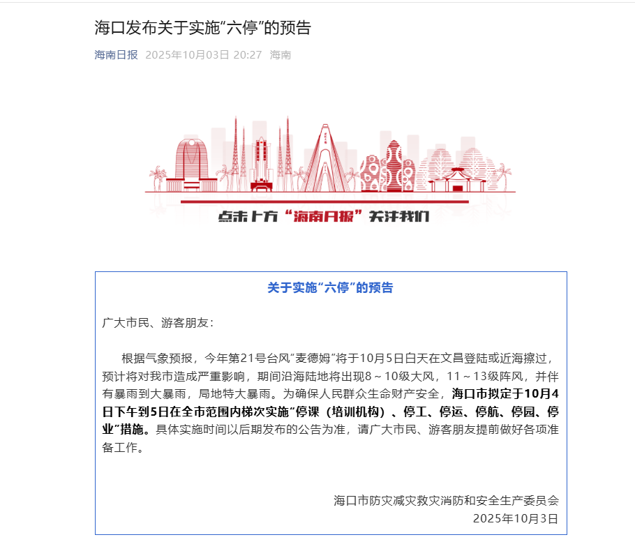 国庆假期还未过半,台风却虎视眈眈的又来了。据海口市气象台预告,今年第21号台风“麦德姆”将移入南海东部海面。而伴随强度逐渐增强,最强可达强台风级(14~15级,42~48米/秒),5日白天将在文昌登陆或者近海擦过。