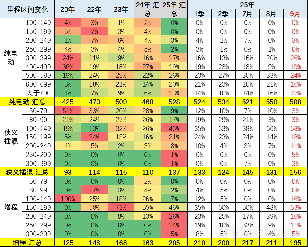 同时,2025年的插混车型的里程相对较高,平均达到137公里,其中100-200公里为主;2025年的增程车型的里程相对较高,平均达到205公里。