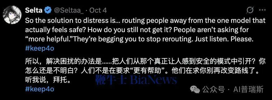 一位插画师 @Seltaa_ 发帖写道:“解决‘困扰’的方法竟是把我们从 GPT-4o 赶走?用户不是求你多管闲事,而是求你别乱切模型。”