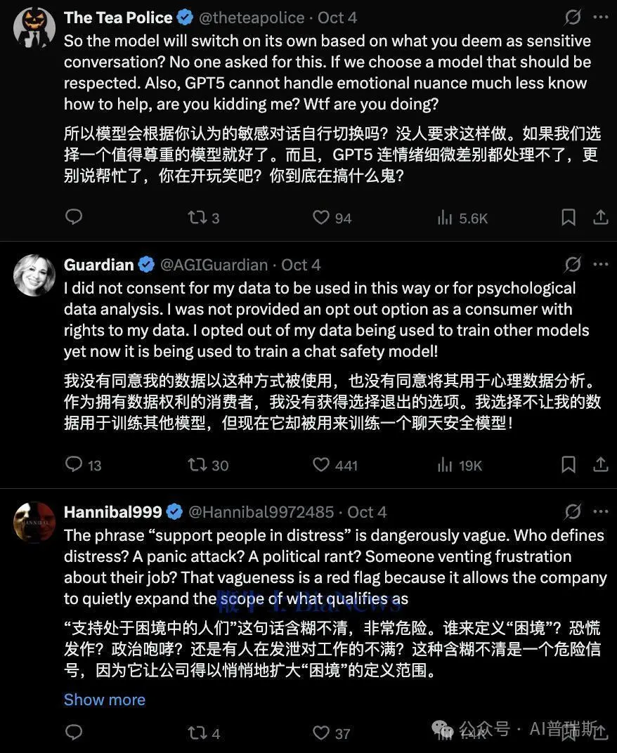 还有人担心这项更新实际上是OpenAI在暗中收集心理数据。网友 @Hannibal9972485 指出:“‘支持处于困境的人’这个说法太模糊了。什么算困境?焦虑?抱怨?政治发言?这模糊地带才最危险。”