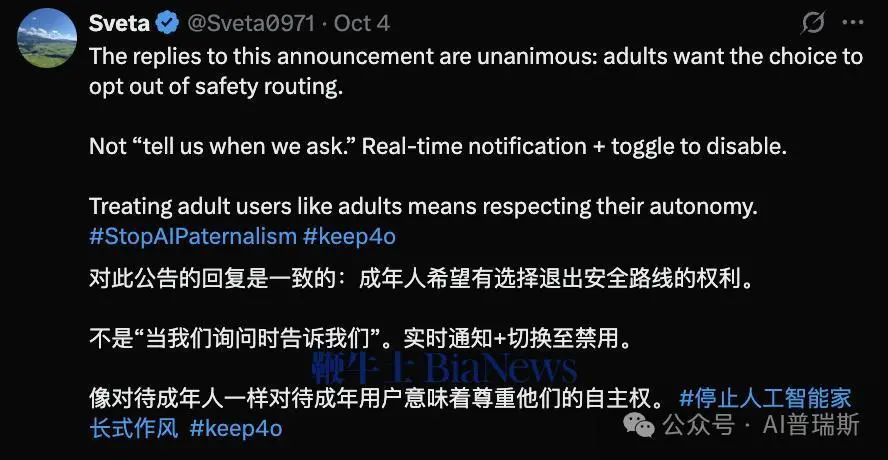 反对声浪中,最核心的不满在于——OpenAI没有提供关闭选项。用户 @Claire 呼吁:“别搞复杂,一键关闭就行!加个免责声明,风险我自己承担。成年人有选择权,不需要AI保姆。”