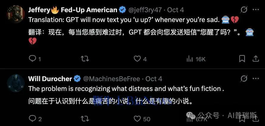 而 @Jeff3ry47 则笑称:“翻译:以后 GPT 会在你难过时发短信问 ‘您醒了吗?’。”
