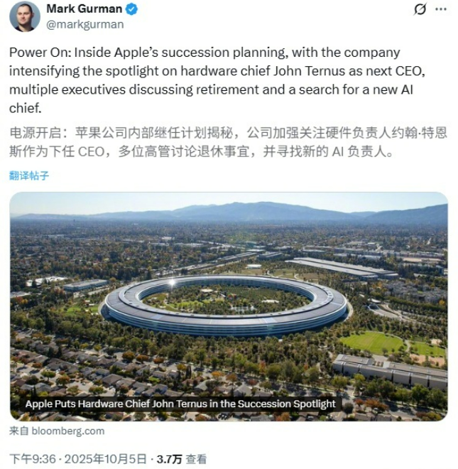 古尔曼表示,苹果硬件工程高级副总裁约翰·特纳斯正逐渐走到走向聚光灯下,在苹果内部呼声最高。