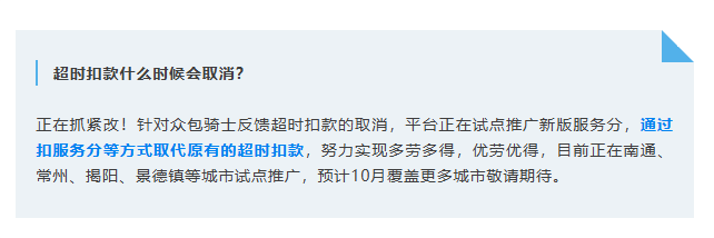今日,饿了么城市骑士发文透露,针对骑士超时扣款取消的问题,平台正在多个城市试点推广取消超时扣款。饿了么表示,针对众包骑士反馈超时扣款的取消,平台正在试点推广新版服务分,通过扣服务分等方式取代原有的超时扣款。
