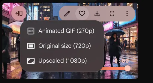 Veo 3.1 FAST 模式默认生成的是 720p,但下载的时候可以提升到 1080p(如上图),可以想象,肯定是要付费的。