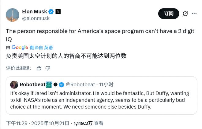 他还在另一条推文中说:“管美国航天那么大事儿的人,智商能那么低吗?”