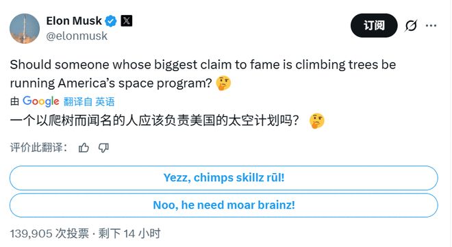马斯克周二甚至发起了一项嘲讽意味十足的投票,暗指杜菲曾是伐木竞技速度攀爬项目的冠军:“让一个靠爬树出名的人掌管美国航天计划合适吗?”两个选项分别是“当然,猴子的本事顶呱呱”和“不,他需要补补脑”。