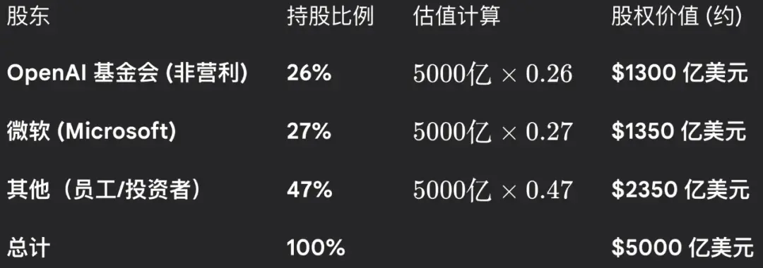 截至重组结束,OpenAI 基金会持有 OpenAI 集团 26% 的股权,根据 OpenAI 公益集团的当前估值,价值约为 1300 亿美元。微软持有 OpenAI 集团约 27% 的股份,其余 47% 由现任和前任员工和投资者持有。