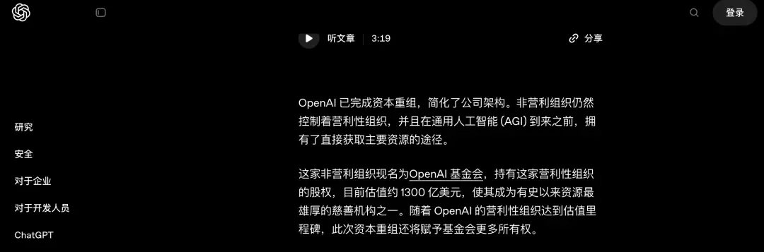 整体来看,OpenAI 对内已展现出对产品路线、收入模式与商业闭环的成熟思考;对外已经对AI 融入社会的复杂命题,展开了多元化的探索。此次重组大戏顺利收官,不仅清除了一些旧有障碍,更将其转化为了公司未来发展的核心优势。
