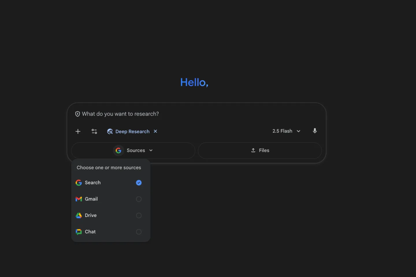 Google表示,此项新功能可以帮助用户进行市场分析,比如让深度研究分析团队初期的头脑风暴文档、相关邮件讨论以及项目规划;也可用于撰写竞争对手分析报告,将公开的网络数据与企业内的战略、比较表和团队聊天内容进行交叉引用。用户在Gemini的提示栏选择“深度研究”后,可自主指定让AI引用的内容来源,包括Google搜索、Gmail、Drive和Chat。这意味着,用户存储在Gmail中的邮件、Drive中的文档、幻灯片、表格、PDF文件,以及Google Chat中的聊天记录,均可为Gemini提供个性化的上下文信息,进一步增强AI的分析能力。