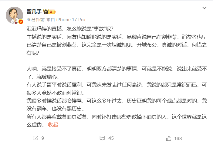他表示,主播说的是实话,网友也知道他说的是实话,品牌直说自己在割韭菜,消费者也早已清楚自己是被割韭菜,这完全是一次坦诚相见,开城布公,真诚的对话,何错之有呢?