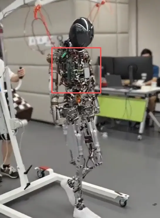 此前机器人往往将算力中心放在的背部或者脑上。但由于头部堆叠了大量传感器,且采用了仿生脊椎的关系,小鹏这次应该是将它移到了脊椎前面的胸部位置。