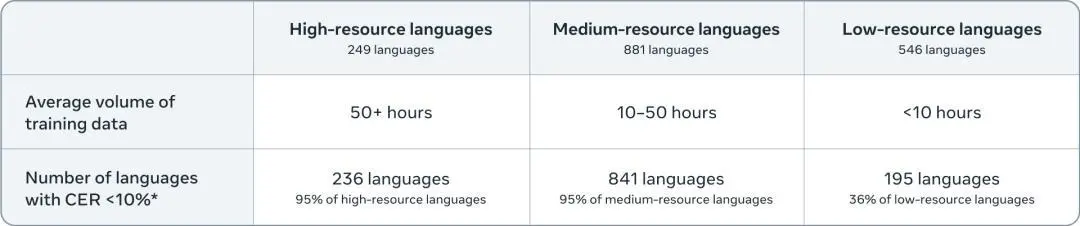 据Meta提供的数据,在所测试的1600多种语言中,有78%的语种其识别错误率(CER)低于10%,若以10小时以上语音数据训练的语种来看,这一比例更是达到95%。