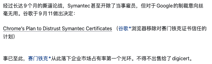 赛门铁克作为一个当时来说,可信度最高的 CA,已经是躺着赚钱了,却依旧存在滥发证书的情况。。。这次的事故,最终导致 2018 年谷歌彻底删除所有赛门铁克的根证书,后者也被迫把旗下的 CA 业务出售给了 DigiCert。