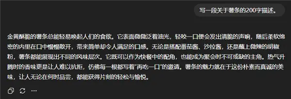 不死心的世超又换了一个问题,让它写一段 200 字的薯条颂,但全文不能出现 “ 的 ” 字。