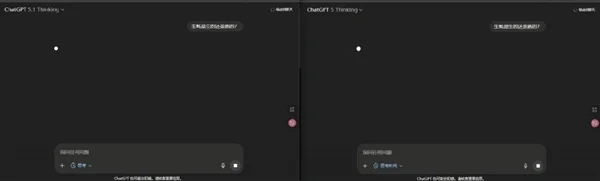 世超试了试,它的效果还挺明显的。在简单的逻辑问题上,左边 5.1 Thinking 的思考速度明显比右边 5 Thinking 要快得多。
