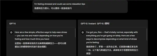 而接下来是大伙儿吐槽得最多的,GPT-5 莫得感情。官方表示,这回 5.1 在 5 的基础上变得 “ 更温暖、更有对话性 ” 了,又能有意思,又能保持回答清晰有用。