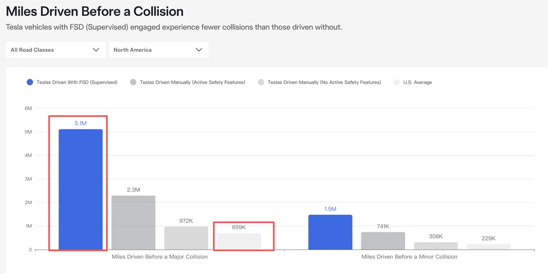 特斯拉在其官网新开设的版块中宣称,在北美地区,使用该公司全自动驾驶(监督版,FSD)系统的车主平均行驶约500万英里(约合805万公里)才会发生一次重大碰撞,而轻微碰撞的发生间隔里程约为150万英里(约合241万公里)。