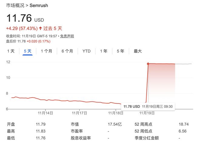收购消息官宣后,Semrush股价暴涨70.97%,创下有史以来的最好成绩。11月19日收盘,该公司股价为11.76美元/股(约合人民币约84元),市值达到17.54亿美元(约合人民币约125亿元)。