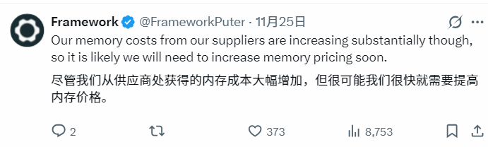 Framework还表示,由于供应商成本的增加,其内存价格很快将不可避免地上涨。