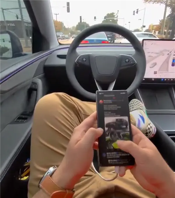 车主实测特斯拉FSD V14 全程玩手机没任何提示