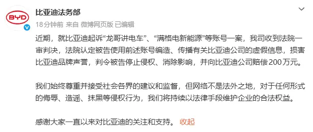 12月25日,比亚迪法务部公布,就起诉自媒体账号“龙哥讲电车”、“满格电新能源”等一案,已收到法院一审判决。法院认定被告使用相关账号编造、传播涉及比亚迪公司的虚假信息,损害了比亚迪品牌声誉,判决被告停止侵权、消除影响,并向比亚迪赔偿人民币200万元。
