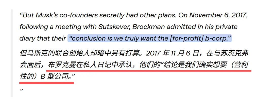 日记中,Greg Brockman承认,他和Ilya“确实想要营利性的B型公司。”