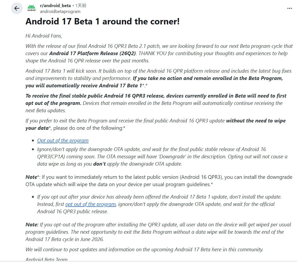 如果用户已经安装了 Android 17 测试版,之后又想在不清空设备数据的前提下退出测试计划,就必须等到整个 Beta 测试周期结束。 当前预期 Android 17 的测试周期将持续到今年 6 月左右。 按照现有信息,Android 17 的正式稳定版有望在 2026 年第二季度面向公众发布,预计会带来多项改进、新的游戏功能以及其他增强体验的特性。