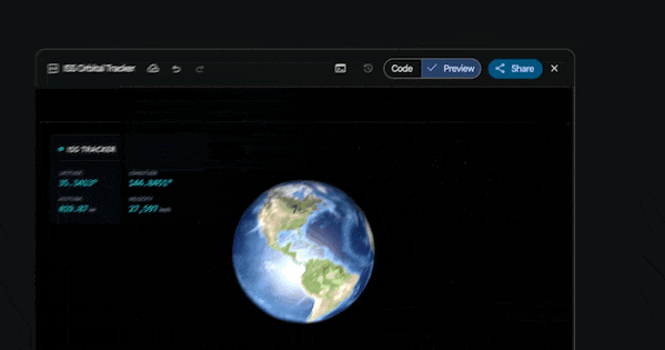 Google给出的示例中,用户给出文字指令,Gemini 3.1 Pro生成了构建一个高保真、可交互的3D国际空间站(ISS)轨道追踪器。使用高分辨率的Blue Marble纹理贴图渲染一个精细的3D地球模型。