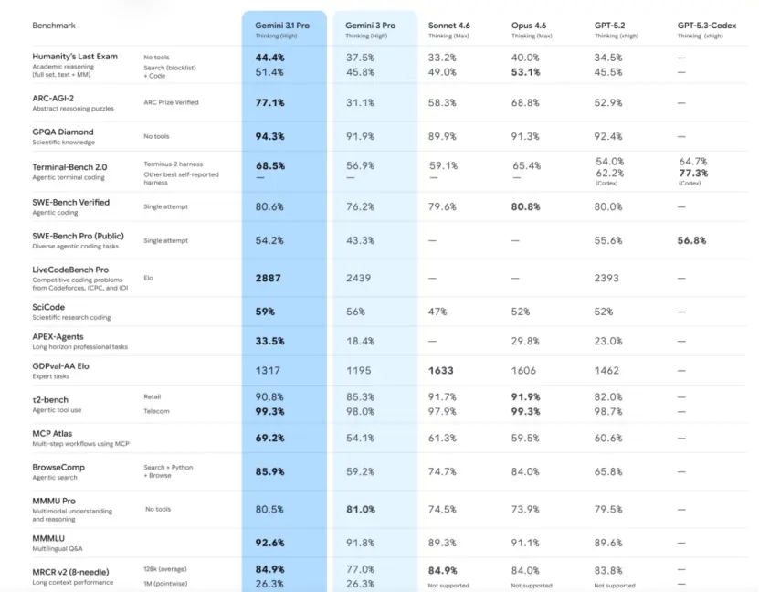 GoogleGemini 3.1 Pro这次在ARC抽象推理和BrowseComp搜索任务上显著拉开差距,显示出明显的Agent倾向,而非单纯知识模型。