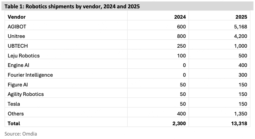 虽然 Omdia 的研报中,多家机器人厂商2024年的出货量数据并不完全准确,但也可以粗粗看个对比,在2024年,各家的出货量还是在1000台以下。