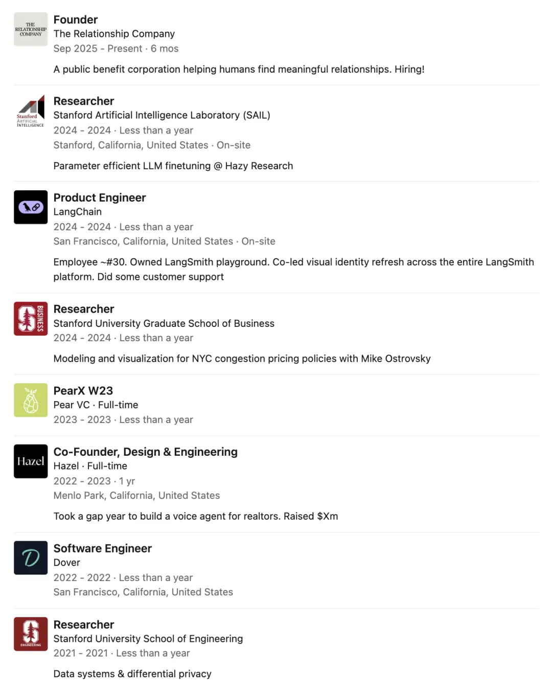 他曾在LangChain负责过AI智能体工具的开发,还联合创办了Hazel(PearX W23),专门为房产经纪人打造AI工作流。