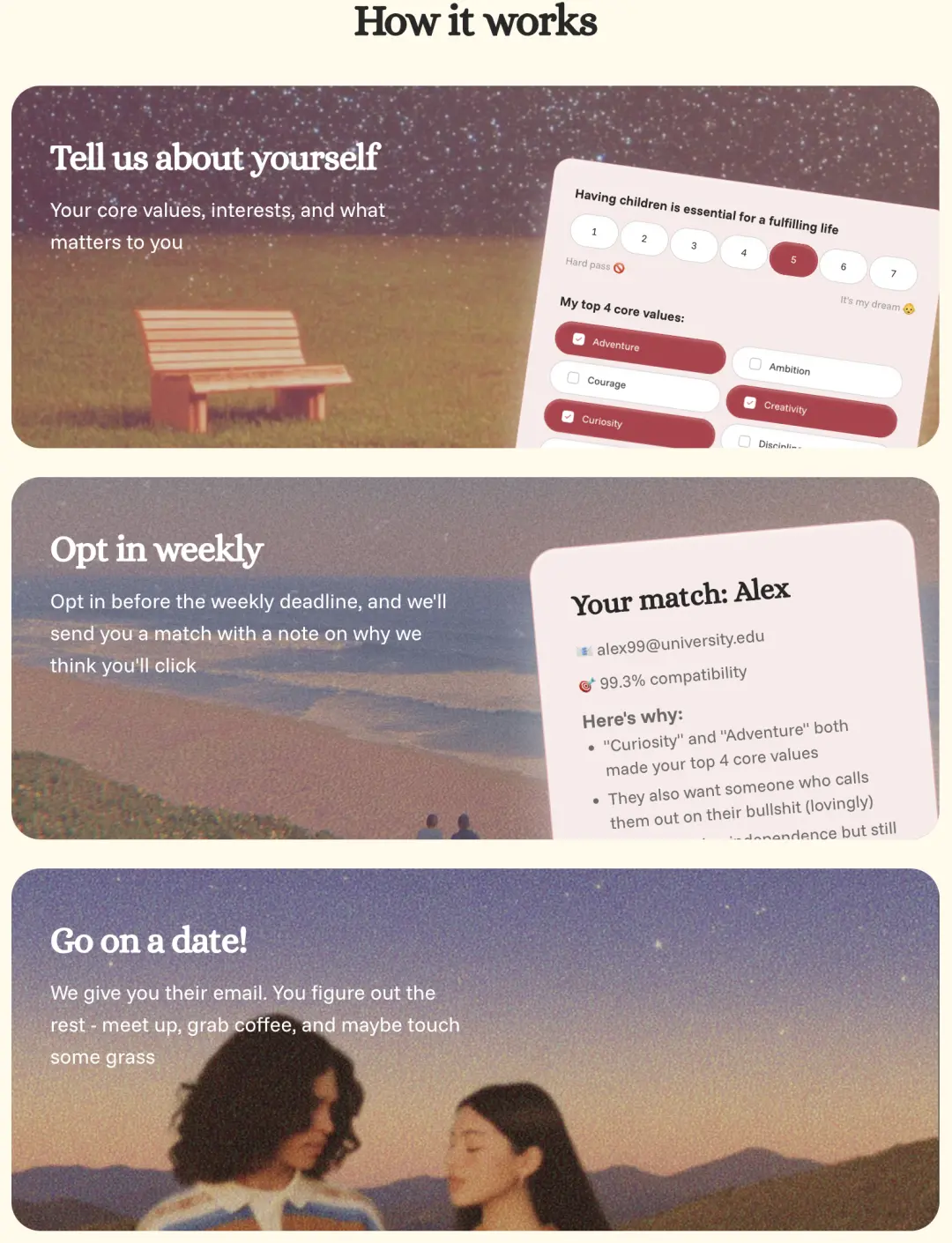 每周参与匹配:在每周截止时间前确认参与,便会发送匹配对象,并附上“来电”的理由。